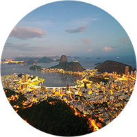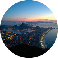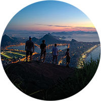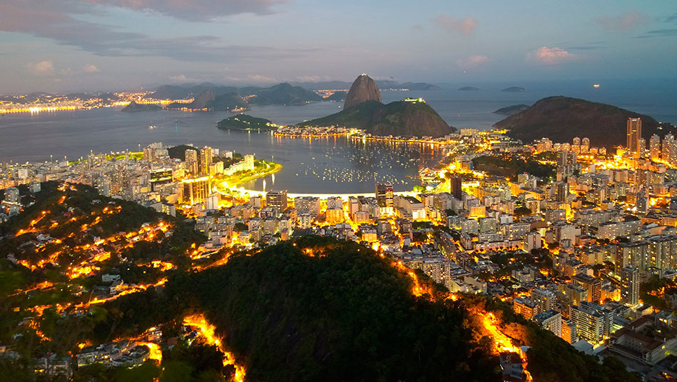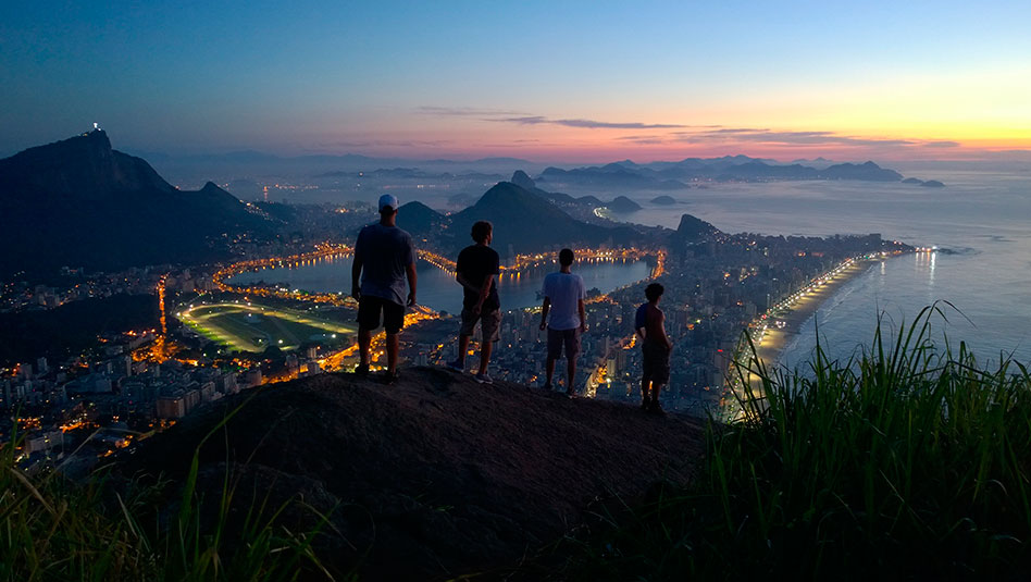 Toward the top, trees disappear and are replaced by grass wet with dew. As we reach the summit, there she is-glowing below us in shimmering pre-dawn twilight. Rio de Janeiro as I've never seen it before, stretched out, sparkling, and gorgeous.