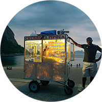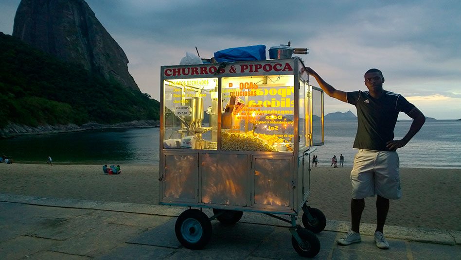 Rio's beaches are crowded with people selling drinks, bathing suits, balls, hats, everything. I especially love to shoot street food vendors. At night, after the sun goes down but before it's completely dark, vendor's carts light up with a magical glow. I met William (the Popcorn Man) at the beach below Sugar Loaf while I was buying a churro. (I don't always eat healthy food on assignment.)